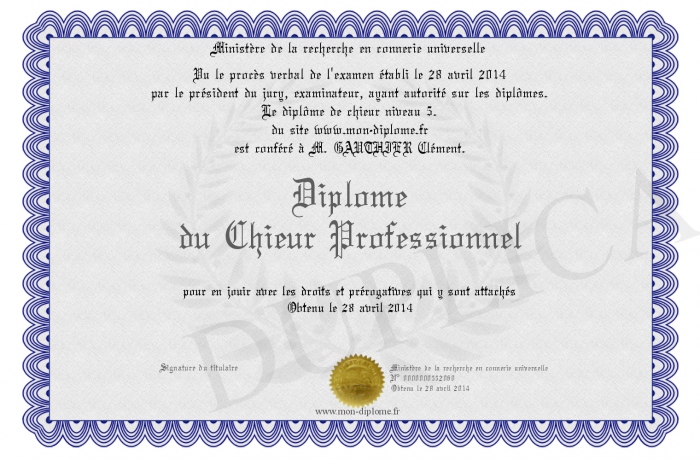 Envoyez par email votre Diplôme du Chieur Professionnel personalisé