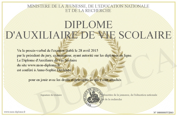 Envoyez par email votre Diplôme d'Auxiliaire de Vie Scolaire personalisé