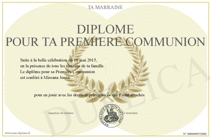 Envoyez par email votre Diplôme pour ta Première Communion personalisé