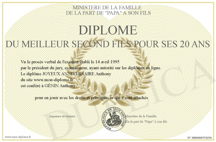 Envoyez par email votre Diplôme du meilleur second fils POUR SES 20 ANS personalisé