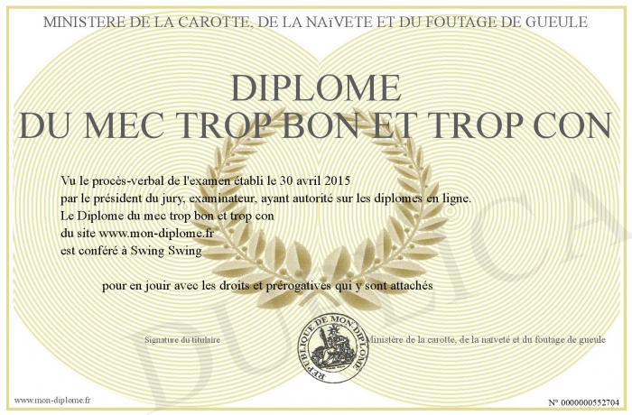 Envoyez par email votre Diplôme du mec trop bon et trop con personalisé