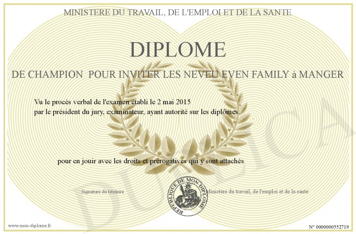 Envoyez par email votre Diplome de champion pour inviter les NEVEU EVEN FAMILY à manger personalisé