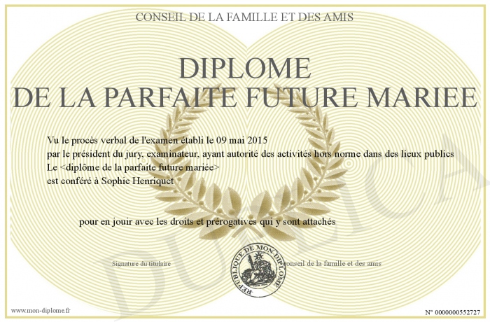 Envoyez par email votre Diplôme de la parfaite future mariée personalisé