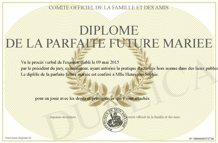 Envoyez par email votre Diplôme de la parfaite future mariée personalisé