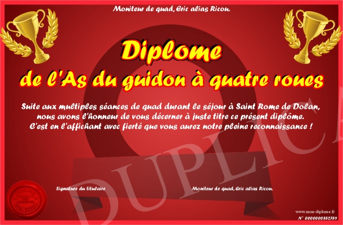 Envoyez par email votre Diplôme de l'As du guidon à quatre roues personalisé