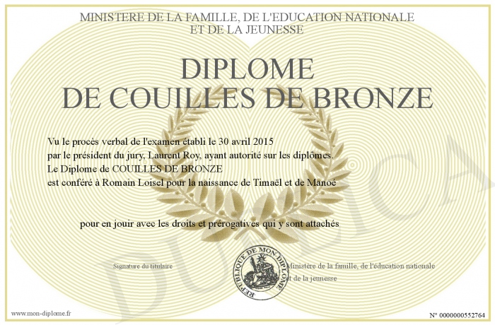 Envoyez par email votre Diplôme de COUILLES DE BRONZE personalisé