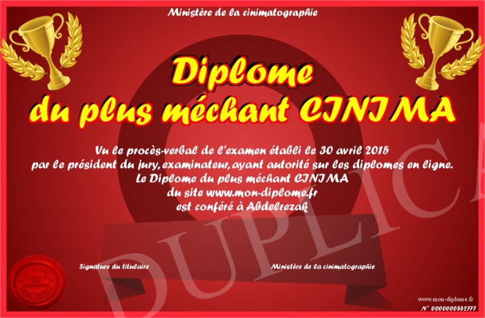 Envoyez par email votre Diplôme du plus méchant CINIMA personalisé