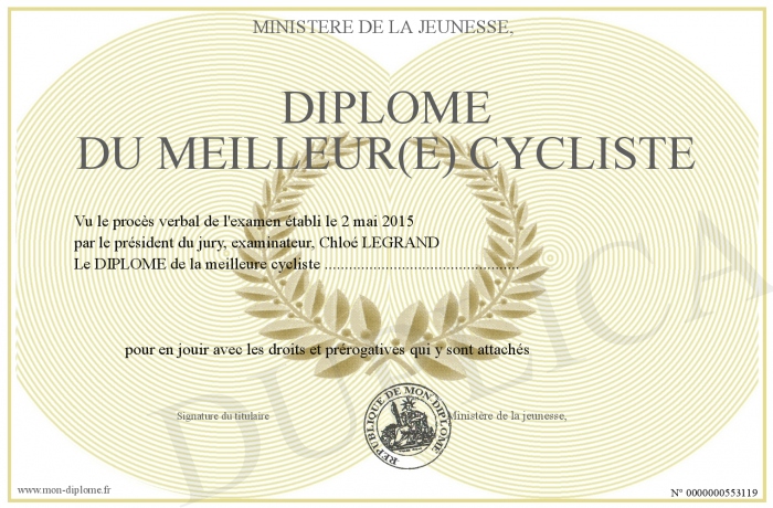 Envoyez par email votre Diplôme du meilleur(e) cycliste personalisé