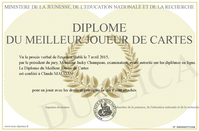 Envoyez par email votre Diplôme du Meilleur Joueur de Cartes personalisé