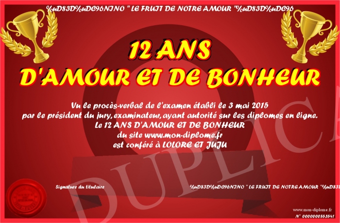 Envoyez par email votre 12 ANS D'AMOUR ET DE BONHEUR personalisé
