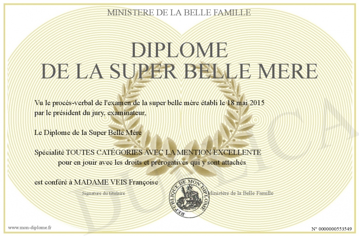 Envoyez par email votre Diplôme de la Super Belle Mère personalisé