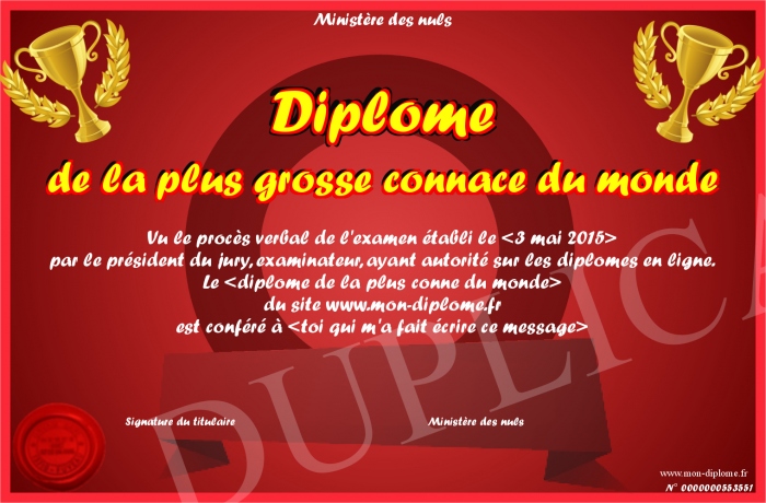 Envoyez par email votre Diplôme de la plus grosse connace du monde personalisé