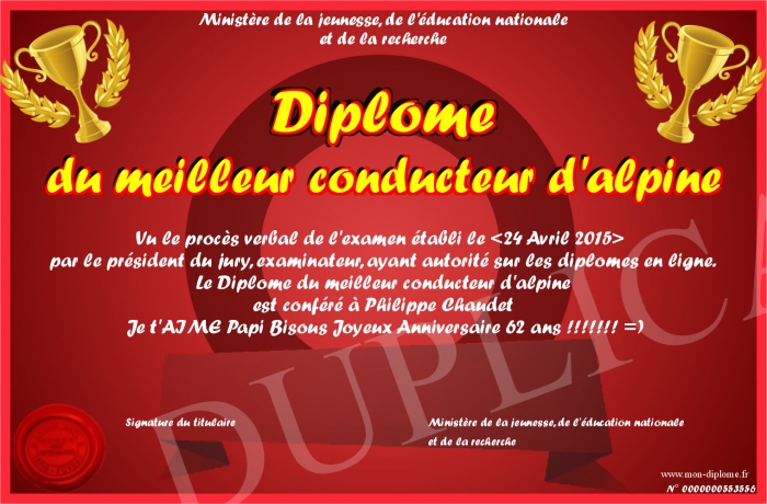 Envoyez par email votre Diplôme du meilleur conducteur d'alpine personalisé
