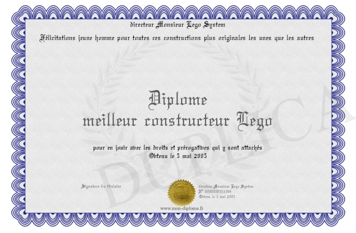 Envoyez par email votre Diplôme meilleur constructeur Lego personalisé
