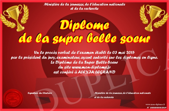 Envoyez par email votre Diplôme de la super belle soeur personalisé