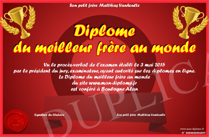 Envoyez par email votre Diplôme du meilleur frère au monde personalisé