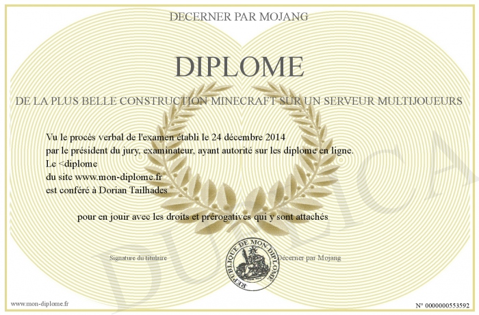 Envoyez par email votre Diplôme de la plus belle construction Minecraft sur un serveur multijoueurs personalisé