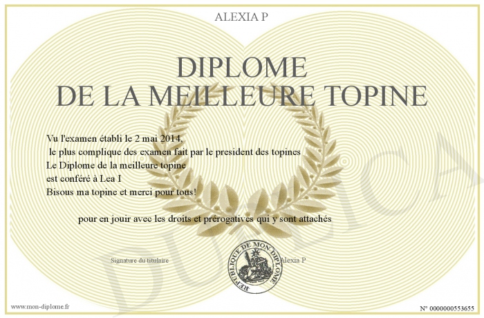 Envoyez par email votre Diplome de la meilleure topine personalisé