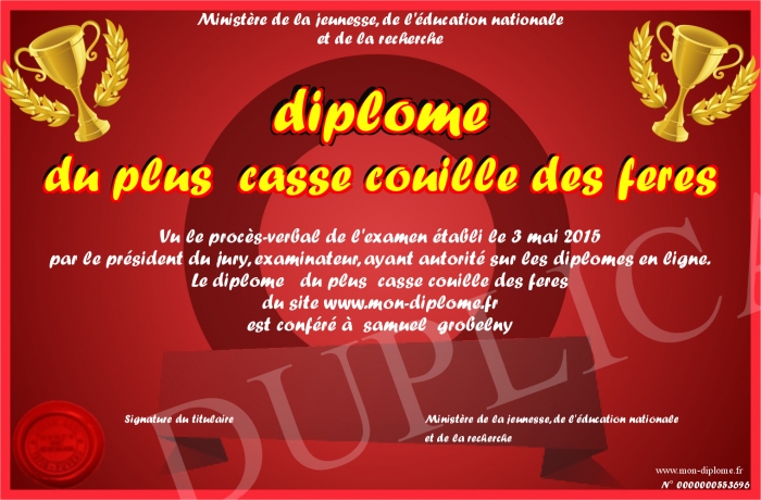 Envoyez par email votre diplome du plus casse couille des feres personalisé