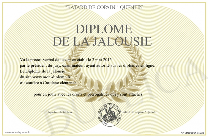 Envoyez par email votre Diplôme de la jalousie personalisé