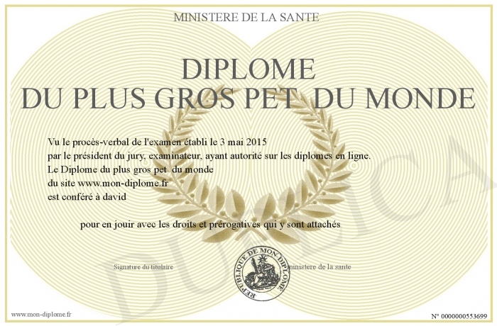 Envoyez par email votre Diplôme du plus gros pet du monde personalisé