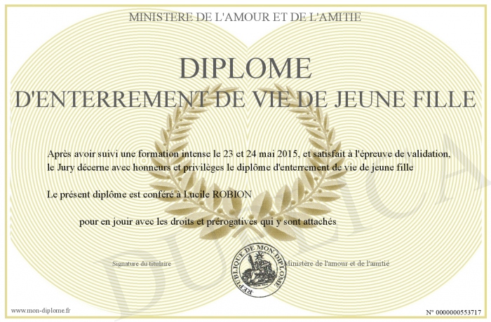 Envoyez par email votre Diplôme d'enterrement de vie de jeune fille personalisé
