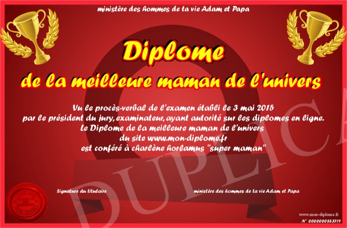 Envoyez par email votre Diplôme de la meilleure maman de l'univers personalisé