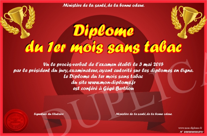 Envoyez par email votre Diplôme du 1er mois sans tabac personalisé