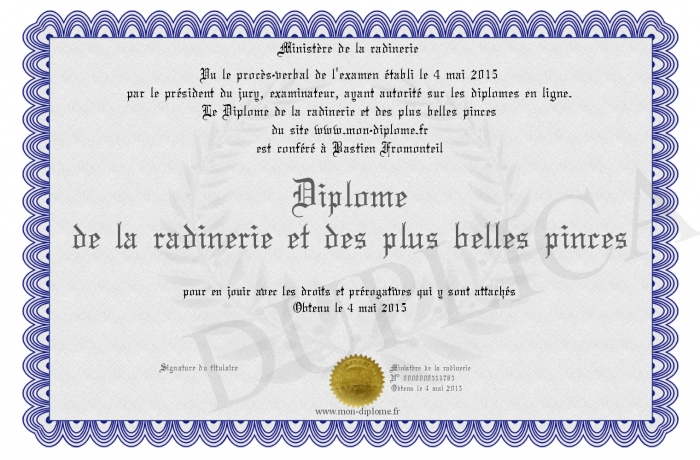 Envoyez par email votre Diplôme de la radinerie et des plus belles pinces personalisé
