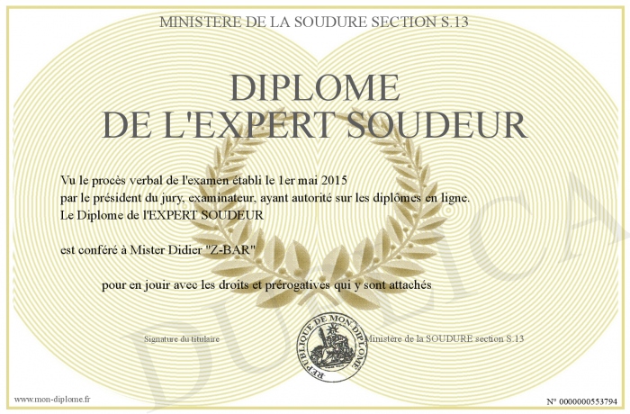 Envoyez par email votre Diplôme de l'EXPERT SOUDEUR personalisé