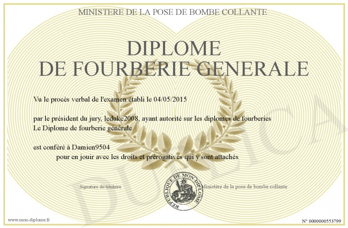 Envoyez par email votre Diplôme de fourberie générale personalisé