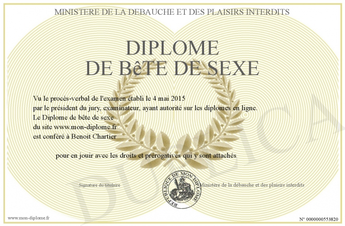 Envoyez par email votre Diplôme de bête de sexe personalisé