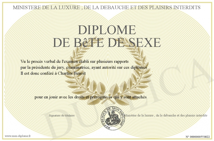 Envoyez par email votre Diplôme de Bête de sexe personalisé