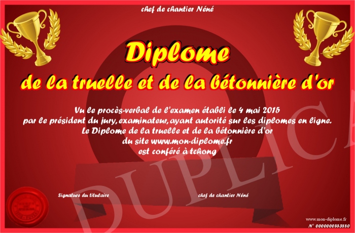 Envoyez par email votre Diplôme de la truelle et de la bétonnière d'or personalisé