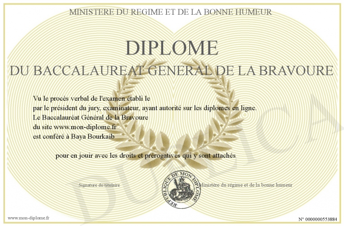 Envoyez par email votre Diplôme du Baccalauréat Général de la Bravoure personalisé