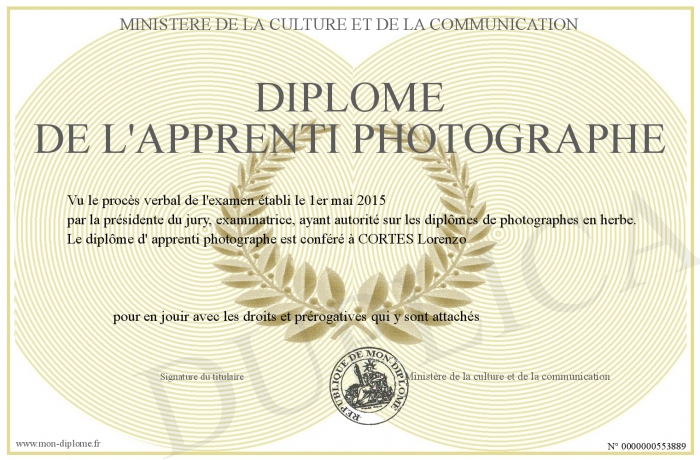 Envoyez par email votre Diplôme de l'apprenti photographe personalisé