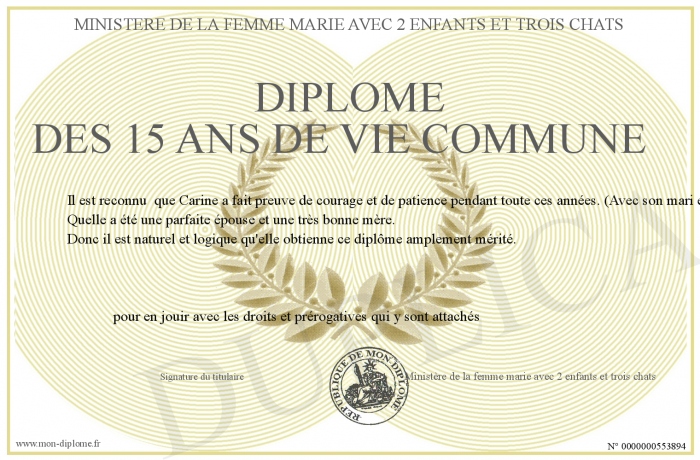 Envoyez par email votre Diplôme des 15 ans de vie commune personalisé