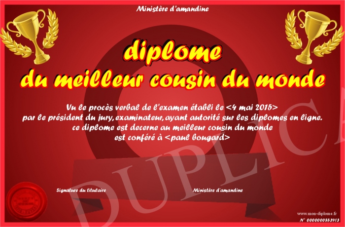 Envoyez par email votre diplome du meilleur cousin du monde personalisé
