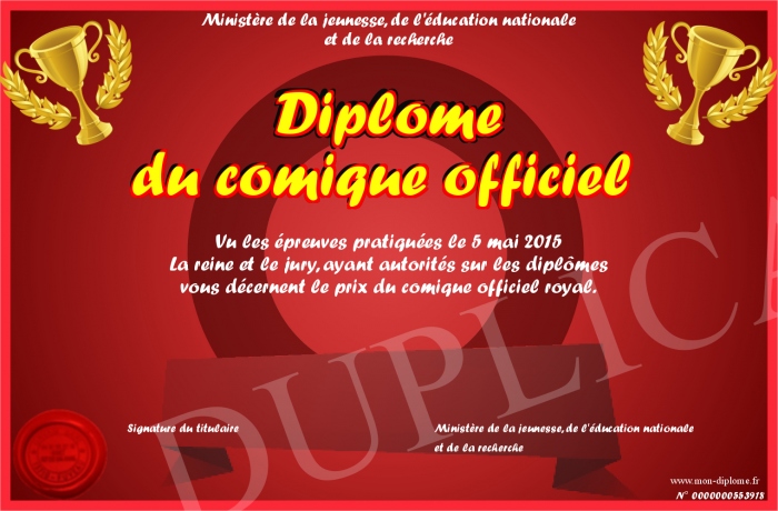 Envoyez par email votre Diplôme du comique officiel personalisé