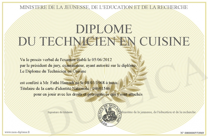 Envoyez par email votre Diplôme du Technicien en Cuisine personalisé