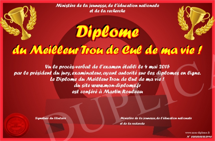 Envoyez par email votre Diplôme du Meilleur Trou de Cul de ma vie ! personalisé