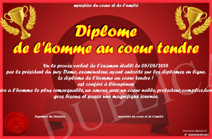 Envoyez par email votre Diplôme de l'homme au coeur tendre personalisé