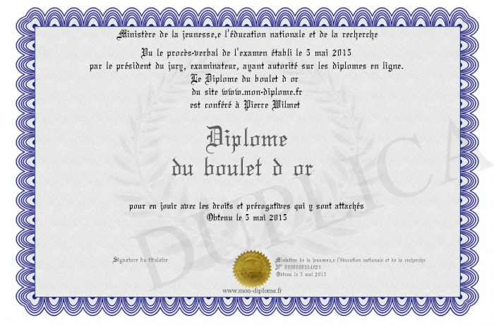 Envoyez par email votre Diplôme du boulet d or personalisé