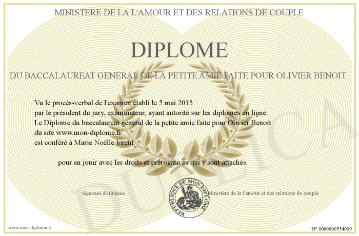 Envoyez par email votre Diplôme du baccalaureat géneral de la petite amie faite pour Olivier Benoit personalisé