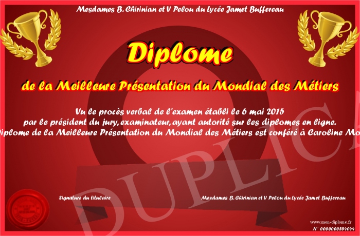 Envoyez par email votre Diplôme de la Meilleure Présentation du Mondial des Métiers personalisé