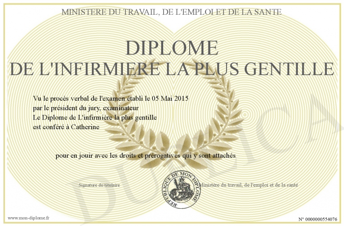 Envoyez par email votre DIPLOME DE L'INFIRMIERE LA PLUS GENTILLE personalisé