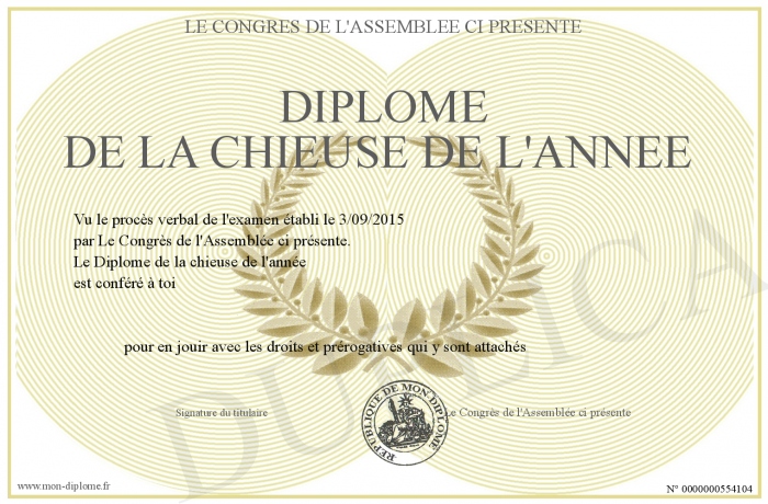 Envoyez par email votre Diplôme de la chieuse de l'année personalisé