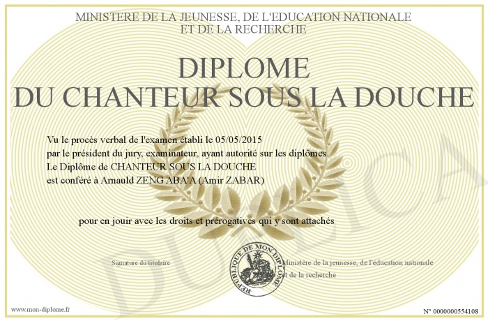 Envoyez par email votre Diplôme du CHANTEUR SOUS LA DOUCHE personalisé