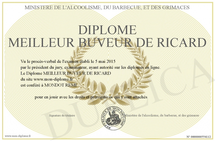 Envoyez par email votre Diplôme MEILLEUR BUVEUR DE RICARD personalisé