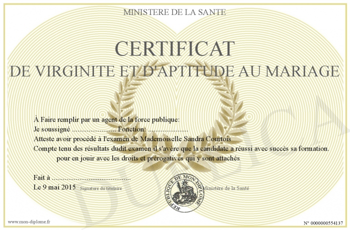 Envoyez par email votre Certificat de virginité et d'aptitude au mariage personalisé